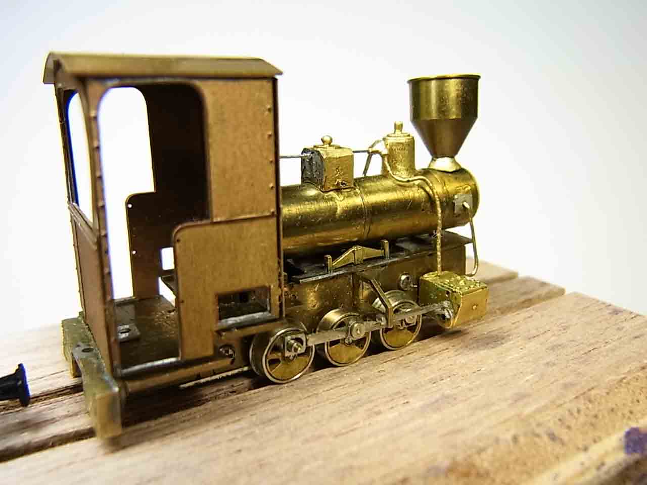 ところで,このキャブ,実は最初に考えていた庵原のキャブなんです.3~4台組んだのですが,引っ越しで全部行方不明です.残っていたのが,このブラスE板から組んだものです.半田も上板には使っていない上に,延性でよれよれ(無論,製品は洋白です)ですが,金田さんの本を参考にして,恐らく日本ではキャブを塞いで居ただろうという予測に基づいて作ったものです.何度かの錯誤を経て,ほぼこの形式にキャブ決めかけていたのですが,実際に庵原のコッペルの写真が残っており,それを見るとキャブは吹き抜け,おまけに煙突は継ぎ足してありました.余りの小形に,そのままだと煙がもろに客車の窓を通過してしまうのです.唯,可成り不格好なので,カタログに近い長さとしました.正直、最後になってのこの変更は、大きな精神的・経済的負担でした。