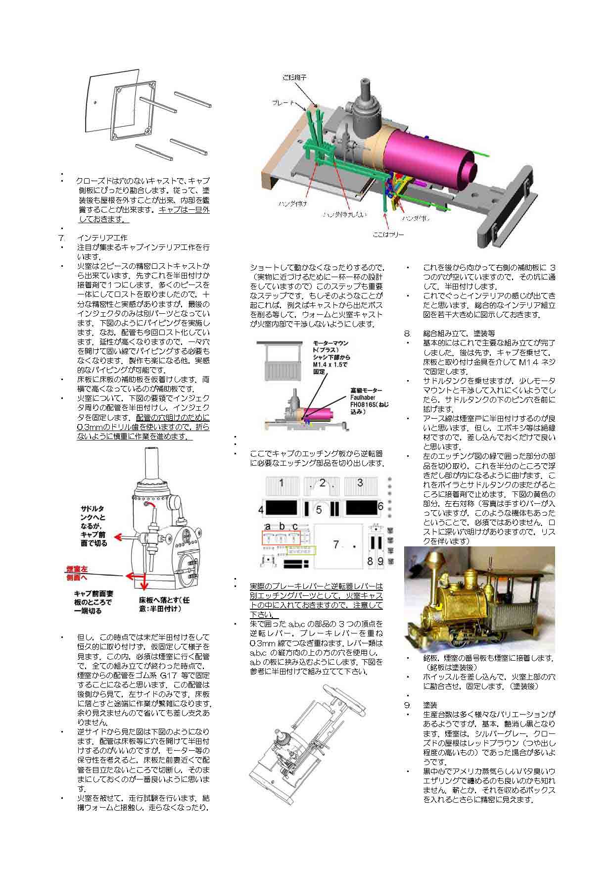 ポーター8トンはやっと組立説明書(インスト)が出来ました.もう本格的蒸気は初めてなので大変でした.HOナローの8トン機関車という小さな機関車ですが,静岡殿の勧めもあって,クリティカル作業となるサイドロッドをかけて出荷するということを書いたのですが,もっと大変なのはこのインスト作りでした.写真を使えば楽なのですが,結構見間違えが起こって矢張り図が一番なのかなと思っています.といいながら結構今まで写真も使わせて頂きました.今回は1枚のみ写真で後は,私が書いた不自然なもの以外,静岡殿が送ってきた美麗な3D図です.早く3Dも覚えなければなりません.写真のものはインストの一部で未定稿なのでわざと画質を悪くしています.実際は「部品全然入ってないじゃないですか,足りないし」「ちゃんと入れてあるだろ.足りないものは発注済みだ,大人しく待っておれ」「ちゃんとユーザーさんの気持ちになって貰わないと,ポーターなんてダダ遅れじゃないですか」と延々と電話.通信費を見て,青くなっています.後,少し,後少しと思いつつやっています.明日をも知れないというのは焦りますね.