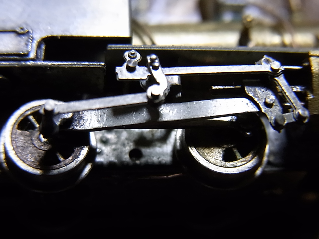 そのような極小リンク機構を例のTMY氏と共同で作る事ができました.正転にテコを倒した動きを再現することが出来ます.ラジアルスも微妙に動いています.逆転ではこのリンクは間違いです.そのような意味で,今までの模型はちゃんと解決(compromise)しています.模型としてはシリンダに固定という解釈で正しいと思います.(どうもニュートラルでも微妙にラジアルスは動いているようですが)昔,中西工房(珊瑚)のOナローで何と無く,メカニカルな正・逆を意識したキットがあって吃驚しました.カシメは昔,静岡から供給された0.3mm,0.4mm特製のピンで,10%くらいの成功率でした.100本は使ったと思います.カシメ失敗と言うより落として行方不明が圧倒的に多かったです.メインロッドが思い切り太いのは見なかったことに。実際あまり見えません(汗 仮設の間に合わせロッドと取り替えるのが面倒くさくて)