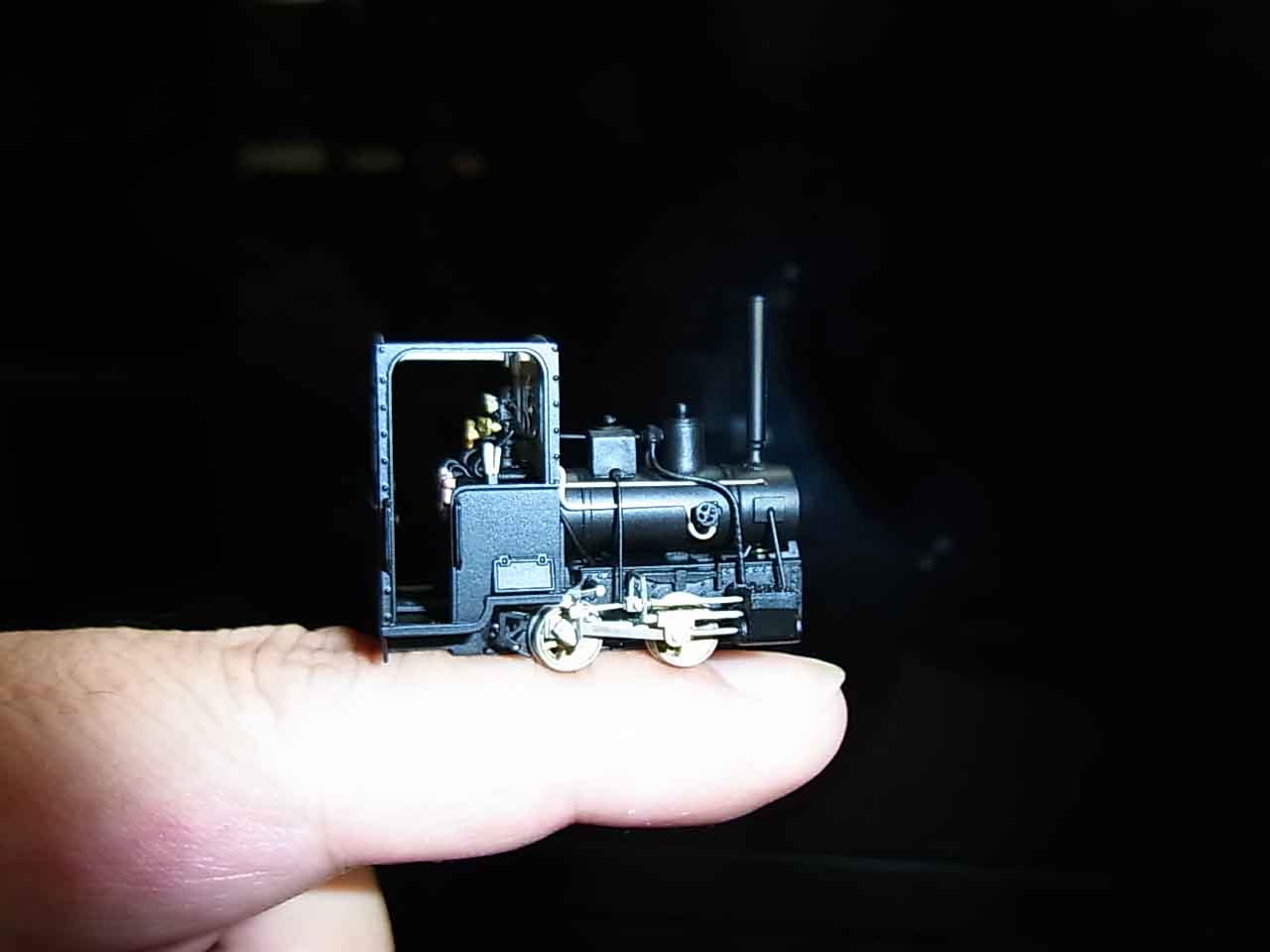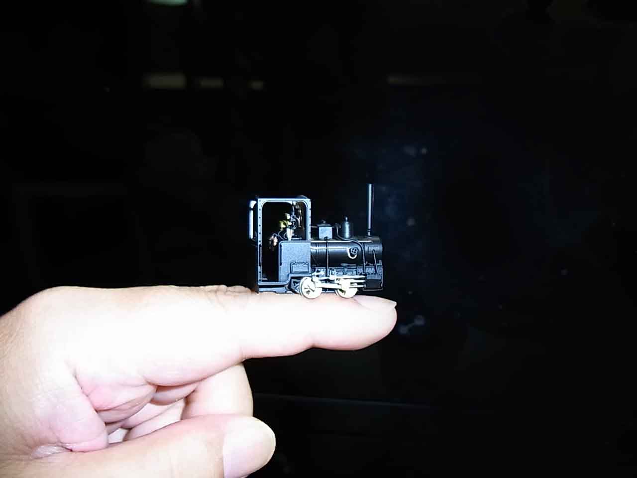 今のところ,2台の庵原完成品の調整,最終チェック,仕上げ,箱デザインの準備を進めていますが,矢張りこの可愛さが伝わっていないと感じるわけです.おっと,どこかのWebで極小機関車を指の上に乗せているのを見つけたぞ.これをパク,いや,参考にしようと一寸撮ってみました.(えらそうなこと書い○国面に堕ちてますね)駄目でしょうか?矢張り皆さんにはこの小ささは見て頂かなければ伝わらないのでしょうか.今年の軽便祭はと思っていただけに,心臓をやったのが呉々も口惜しいです.